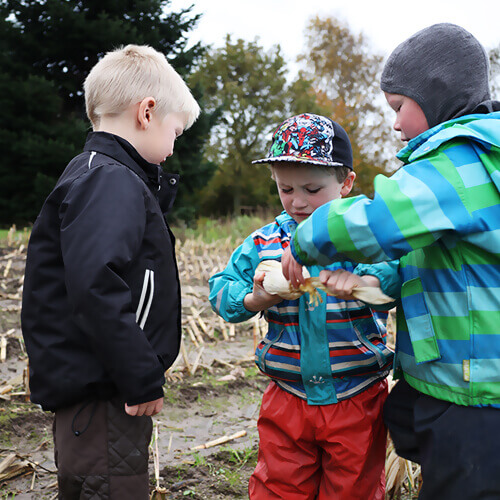 Børnene er ude hver dag – enten på legepladsen eller i Byparken, som er vores nærmeste nabo og som vi bruger som et ekstra udendørsrum. Byparken rummer en lille sø, en bæk der løber gennem parken, bålhytte, sneglehøj, et skovstykke og shelter med bålplads.